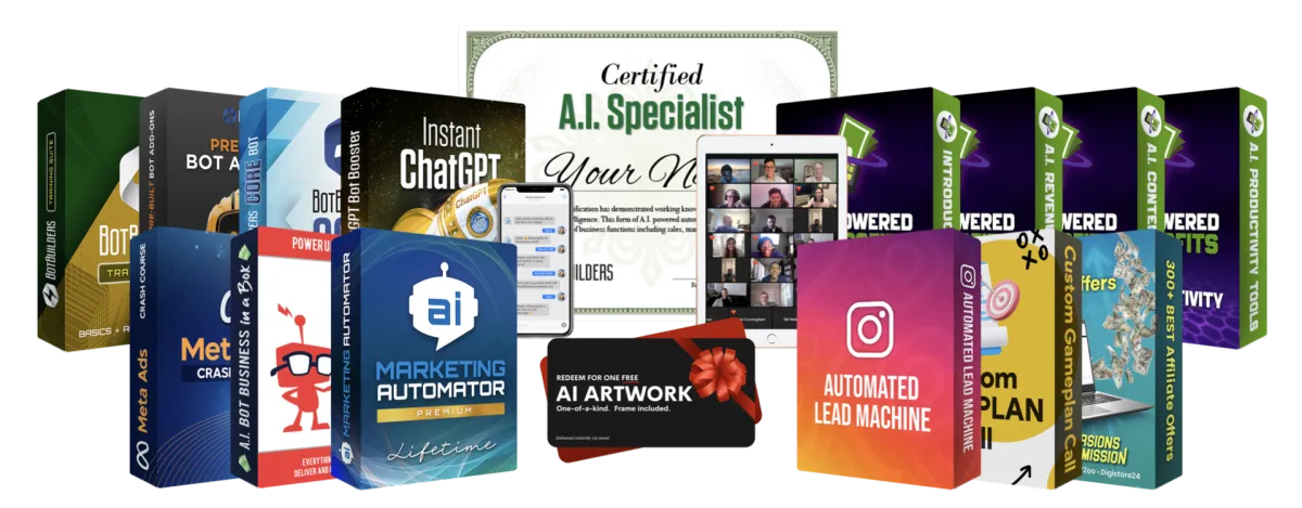 Pre-Built Chatbots + Training & Certification + A.I. Marketing Tools +Bonus Package + Lifetime Support