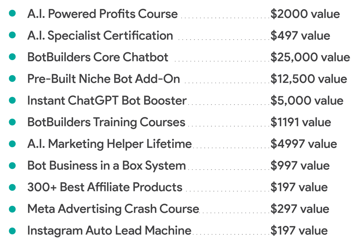Pre-Built Chatbots + Training & Certification + A.I. Marketing Tools +Bonus Package + Lifetime Support